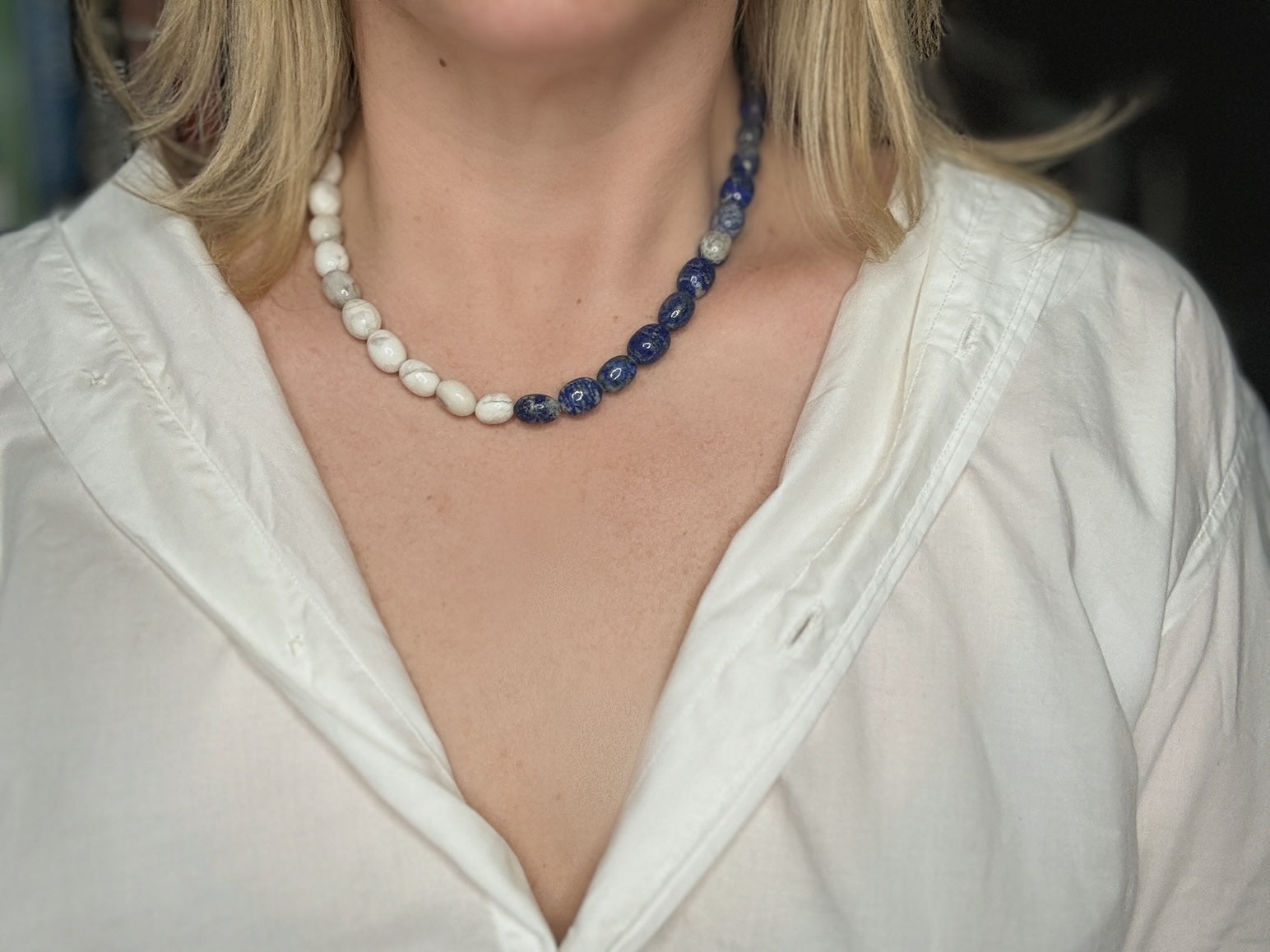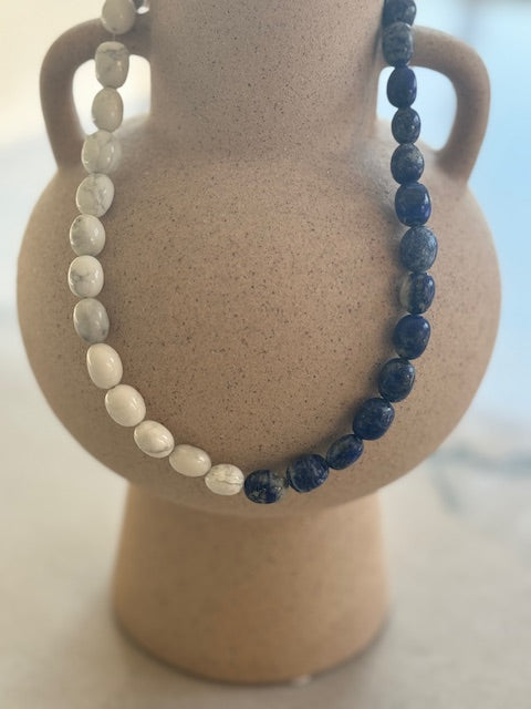 Lapis Lazuli and White Tourmaline are powerful gemstones known for their unique ability to inspire clarity, foster spiritual growth, and strengthen your connection to your personal truth. Lapis Lazuli enhances wisdom, intuition, and communication, while White Tourmaline promotes balance and shields against negativity. Together, they create a harmonious energy that supports you in manifesting your dreams with confidence and focus. This beautiful necklace is not only a statement of exquisite craftsmanship but also a meaningful tool for self-empowerment and transformation.